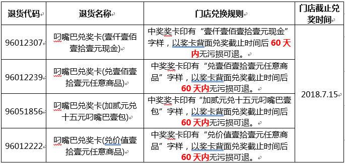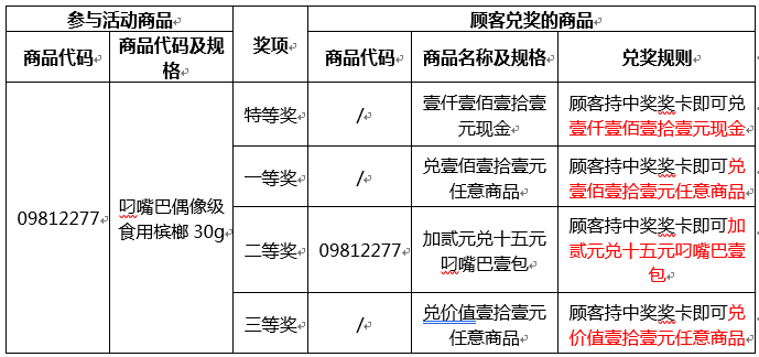 致尊敬的客户: 你好!即日起至2018年6月30日顾客购买叼嘴巴系列槟榔,即可参加如下中奖活动,详情请见以下参与兑奖活动商品及退货要求说明。 详情请看下文!谢谢! 一、参与兑奖活动商品